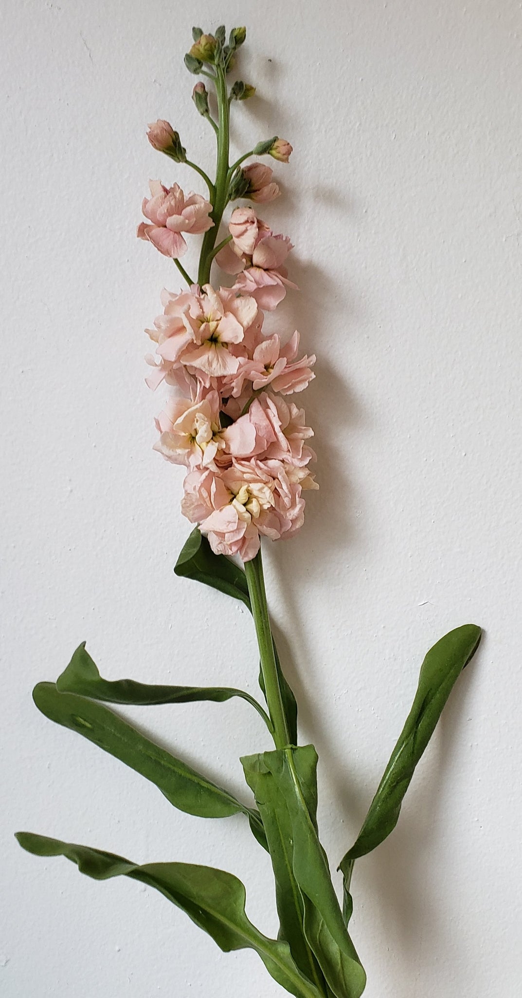 This light pink to peach stock is beautiful with its ruffled blooms that have tall leafy stalks. This flower will add height to arrangements and fragrance to your home or event.