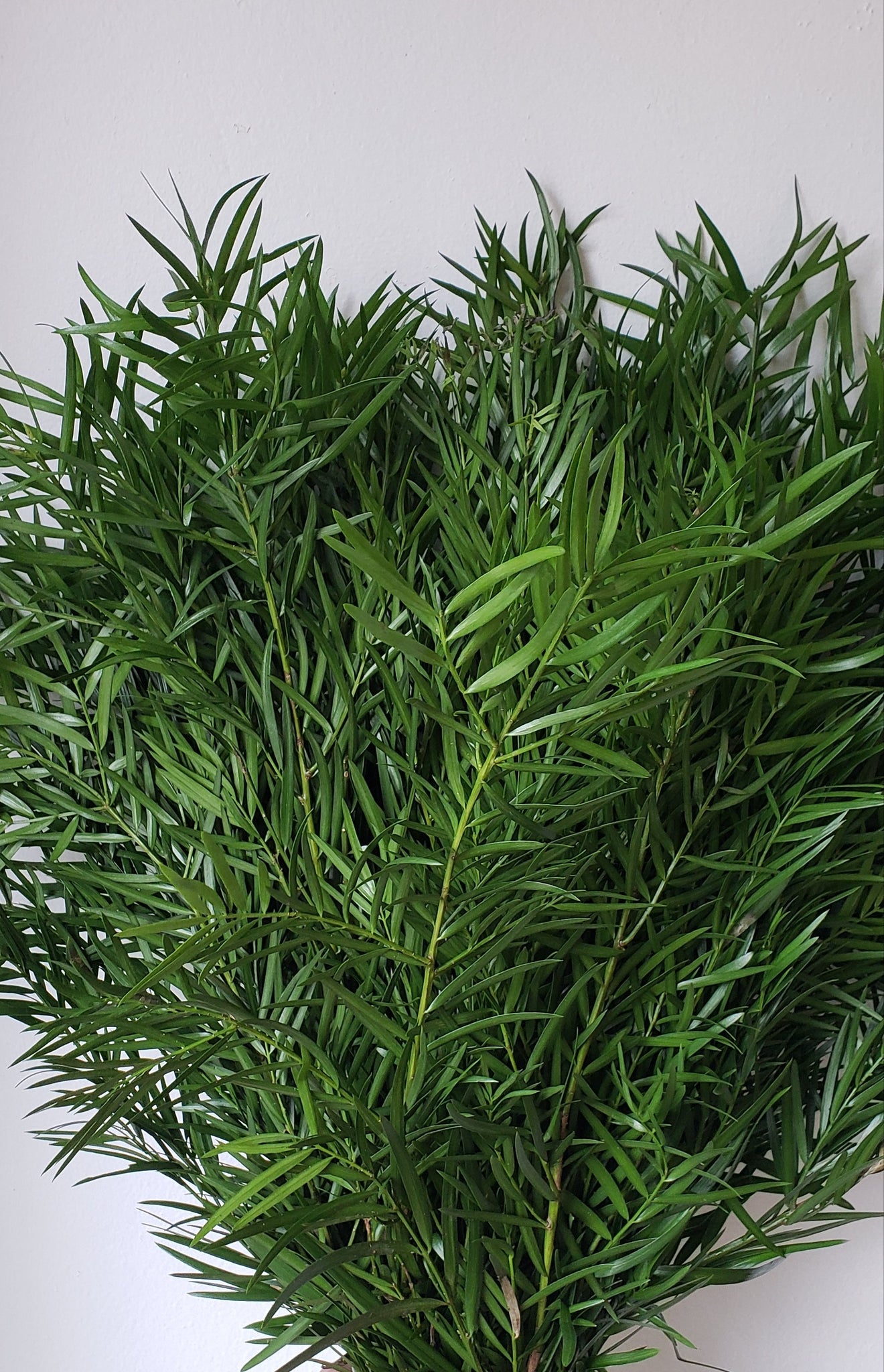 Weeping podocarpus is a dark and shiny decorative foliage. With its wispy, leaves, it is bound to spice up any arrangement.